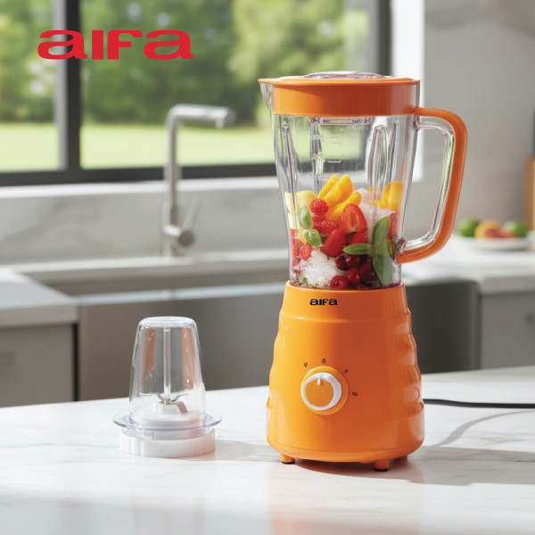 A versatile kitchen appliance designed to make food preparation easy and efficient. Featuring two speeds with a pulse function, it allows for precise control over blending consistency. The 4-leaf stainless steel blades ensure smooth and thorough blending, while the included grinder attachment is perfect for dry products. Powered by a robust 500W copper motor with thermostat protection, this blender guarantees durability and safety. Whether you’re making smoothies, soups, or grinding spices, the AIFA AB-L5022 is your reliable partner in the kitchen.