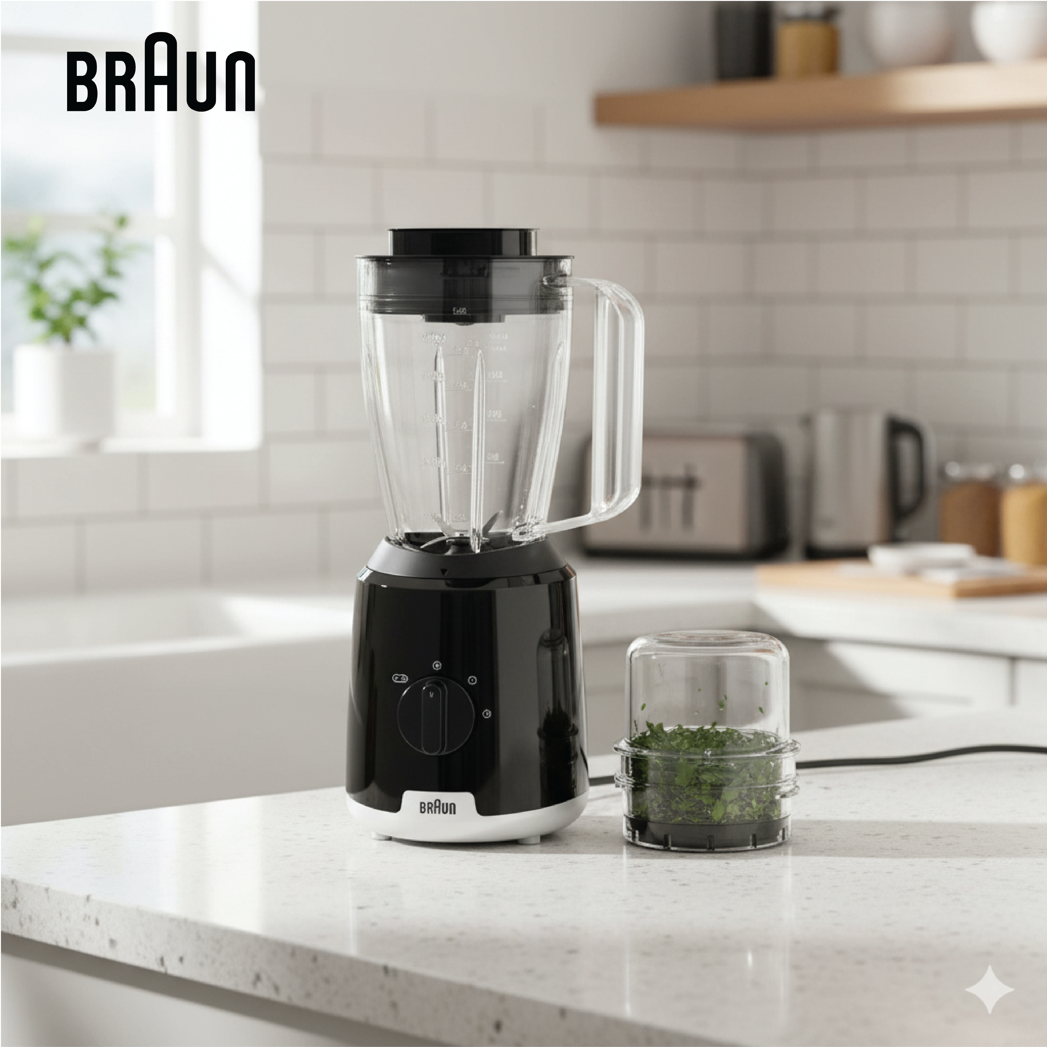 Blend, chop, and crush with ease using the BRAUN JB1015 PowerBlend 1 Blender. Powered by a 600W motor and advanced TriAction Technology, it ensures smooth and consistent blending every time. The 1.5L BPA-free jug is designed with a secure lock system and motor protection features for safe, reliable use. With two speed settings plus an ice crush function, it handles everything from smoothies to frozen drinks effortlessly. The included chopper attachment makes quick work of onions, nuts, herbs, and cheese, while its easy-to-clean design keeps your kitchen routine simple and efficient.