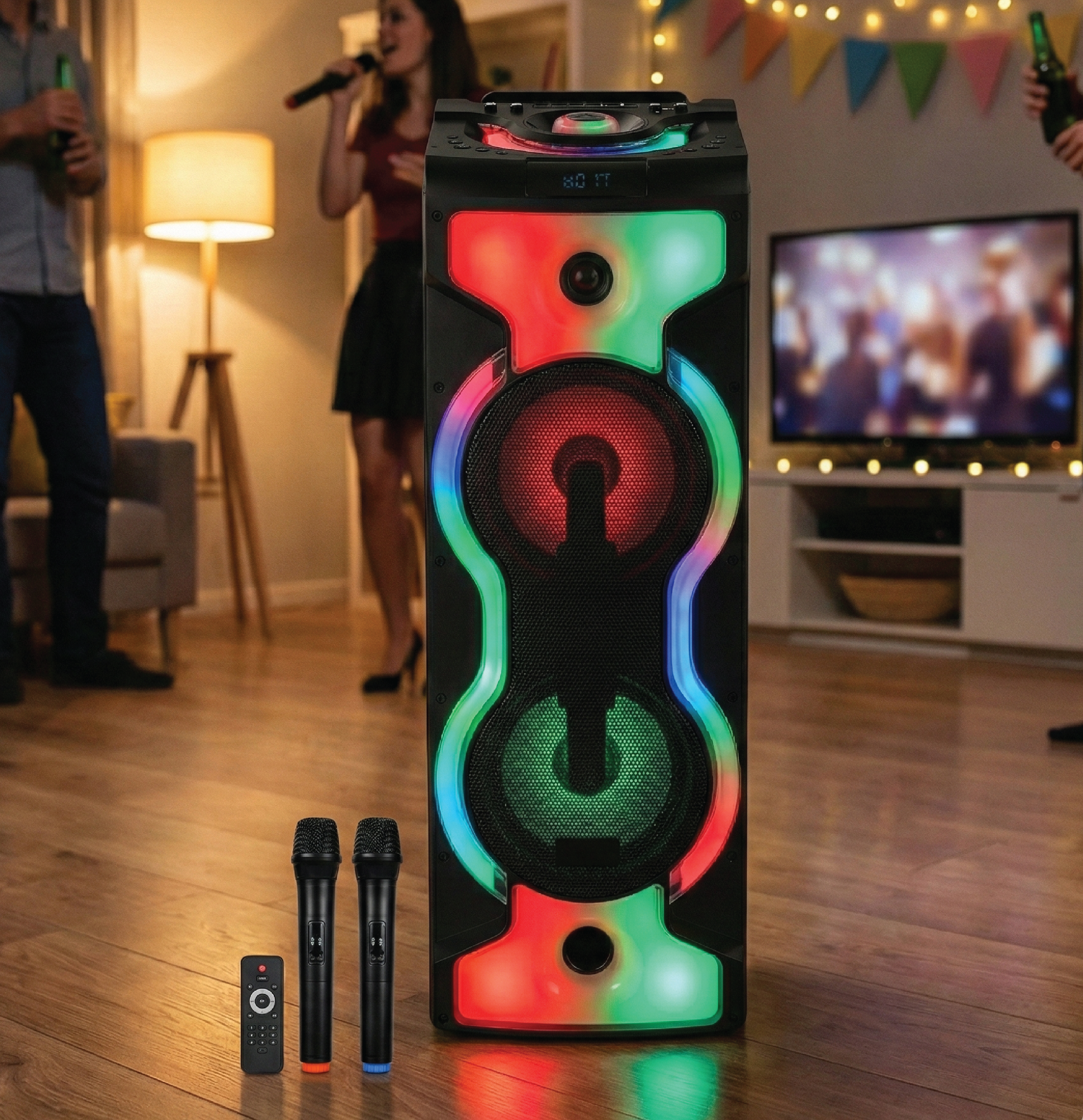 - Two karaoke mic input jacks for vocal performances.