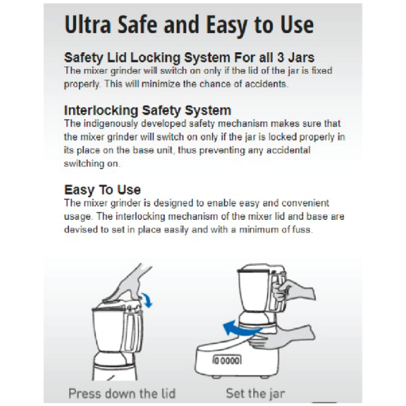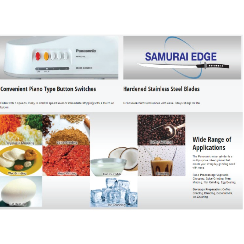 The Panasonic MX-AC210SW mixer grinder is your companion in the kitchen, combining power, efficiency, and convenience to simplify your food preparation tasks. With its robust motor and multifunctional capabilities, this appliance makes cooking an enjoyable experience.