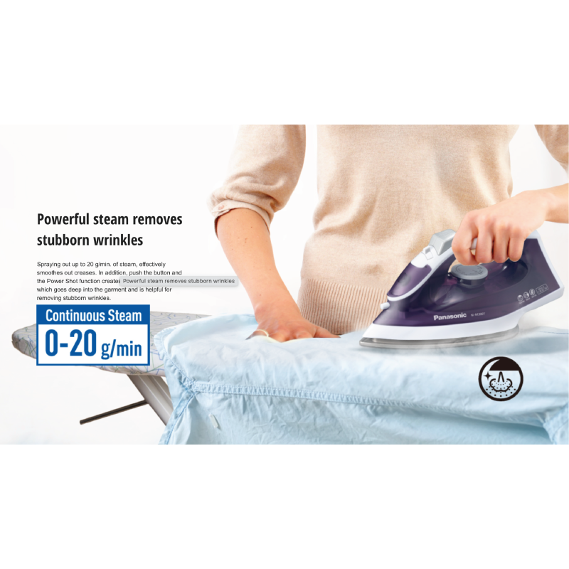 Experience effortless ironing and impeccable results with the Panasonic NI-M300T Steam Iron. Designed to streamline your garment care routine, this steam iron is crafted to deliver exceptional performance and convenience, ensuring your clothes look pristine with every use. With its powerful steam spraying out up to 20g/min of steam, you won't have to worry about those stubborn wrinkles any longer.